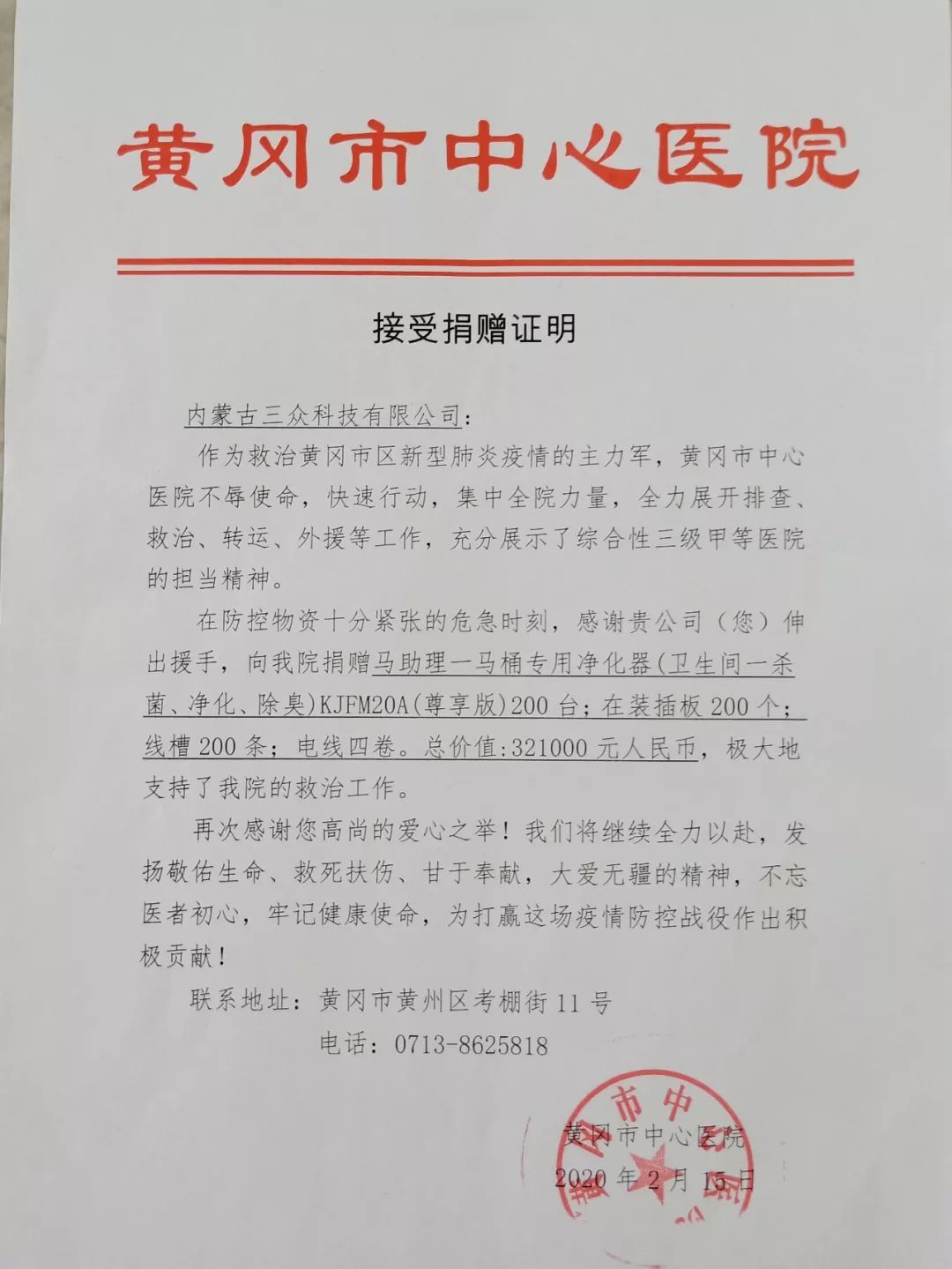 在這眾志成城、共克時艱的時刻,身在后方的我們也迫切的想做些什么,希望能為抗疫貢獻一股小小的力量!三眾科技從大年初二疫情爆發時,就立即開始與相關部門就捐贈事宜進行聯系。起初病毒傳染方式單一,各大醫院迫切需要口罩、防護服等物資,由于馬助理是衛生間殺菌凈化的產品,一直找不到受捐單位。疫情后期發展傳染方式不斷增多,尤其通過氣溶膠傳播,專家發出預警要讓廣大市民注意衛生間傳播的預防工作。這時得知湖北黃岡市大別山醫療中心向社會發出需要移動式消殺凈化設備。我公司很快與醫院取的聯系并達成捐贈事宜。