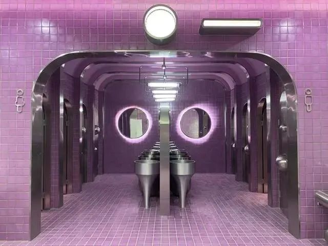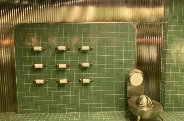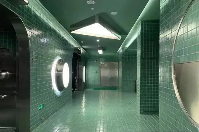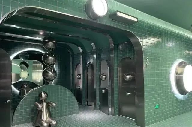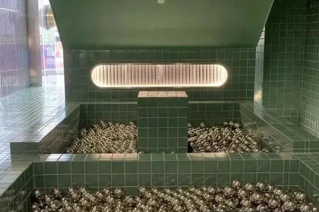 一走進,還有點懷疑是不是找錯了地?因為真的不太像是廁所,所見是一條長長的、貼滿綠色格子瓷磚的、朋克氣息隆重的長廊。再往前去點,一個小池子里滿是銀色的海洋球,真真的復古又好看。