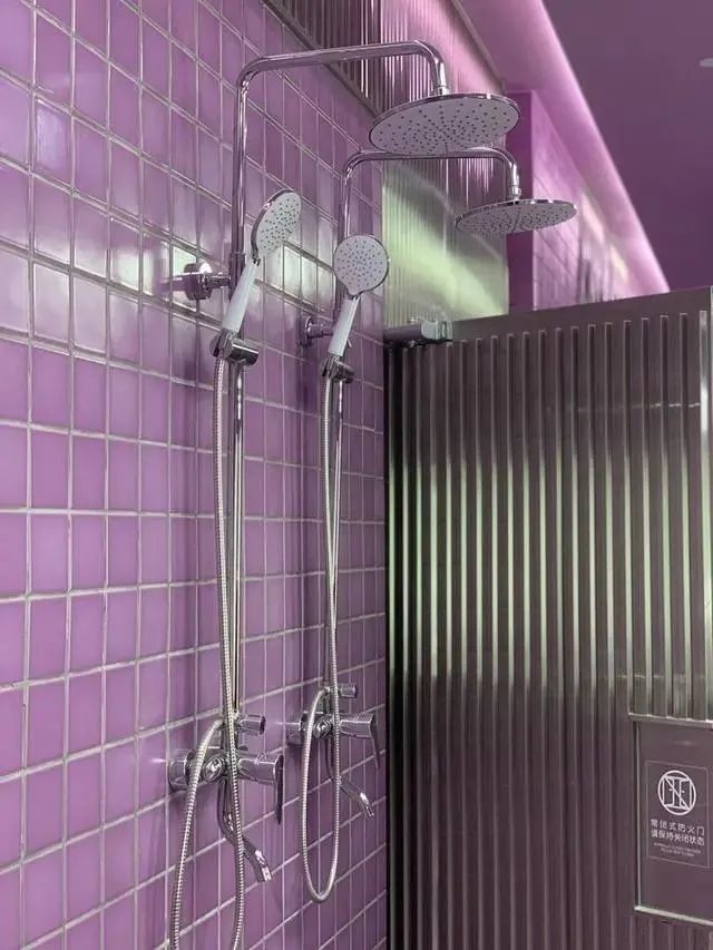 三樓的廁所更適合少女心滿滿的女生,從地上、墻壁、天花板全部都被粉紫色格子的瓷磚所覆蓋。