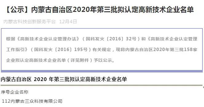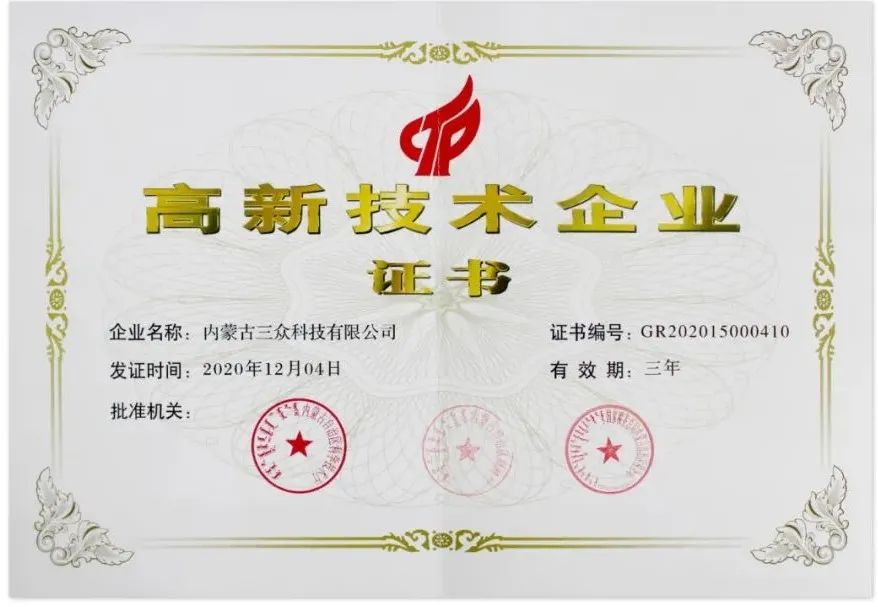 2020年12月傳來喜報,三眾科技順利通過由國家科學(xué)技術(shù)部擬定,內(nèi)蒙古自治區(qū)科技廳、財政委、國稅局、地稅局實(shí)施評定的國家高新技術(shù)企業(yè)認(rèn)定,獲得“國家高新技術(shù)企業(yè)”的榮譽(yù)稱號,可喜可賀!