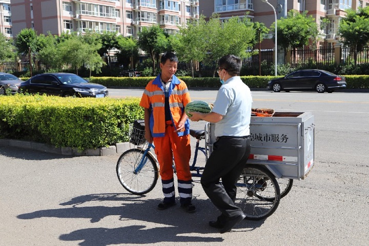 中午,在環(huán)衛(wèi)大爺與阿姨休息之后,馬助理市場部工作人員親自切好西瓜分發(fā)給大家,親切地向他們詢問工作時間、休息場所等,并囑咐他們注意安全、做好防暑。他們表示,雖然天氣炎熱、工作幸苦,但是感受到了馬助理送的清涼與關(guān)愛,十分感謝。