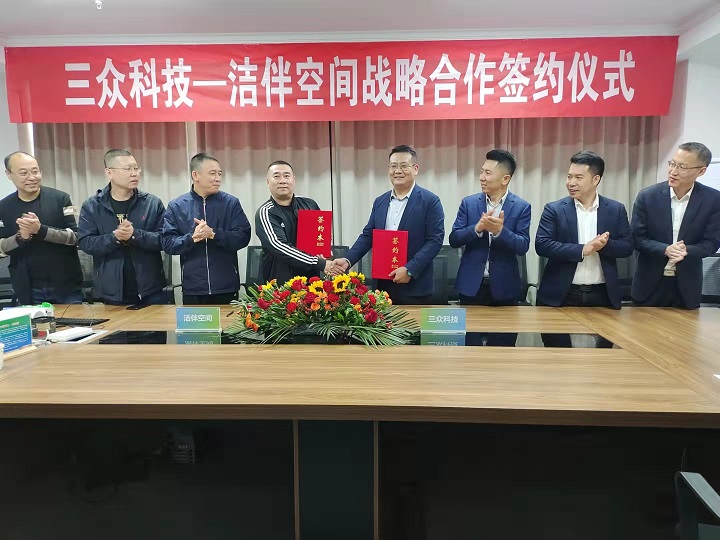隨后,趙云和侯慶山分別代表三眾科技和潔伴空間簽署戰(zhàn)略合作框架協(xié)議,并合影留念,三眾科技于潔伴空間正式達(dá)成戰(zhàn)略合作!