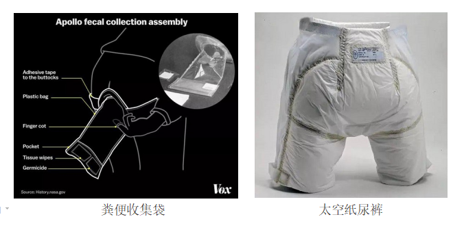 在失重的太空中,宇航員在飛行中的“如廁”問題亟待解決。人類載人航天探索初期,飛行任務不會太久,所以經常通過食用低殘渣飲食、飛行前做腸道清潔等方式來避免如廁。隨著飛行時長的增加,如廁問題難以避免,于是阿波羅飛船上的宇航員開始使用糞便收集袋,使用時用膠布把收集袋粘在屁股上,使用后加入殺菌劑密封并均勻揉搓,以免糞便產生的氣體使袋子爆炸。宇航員在太空停留的時間越來越長,繼糞便收集袋、尿液收集袋之后,華人唐鑫源發明了太空紙尿褲,可以讓航天員在10個小時之內不用脫去宇航服,內部解決“方便”問題。